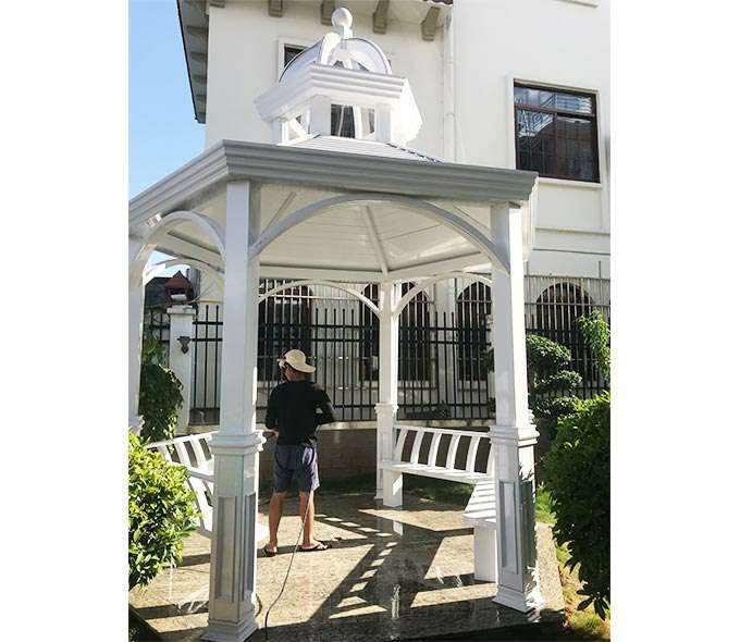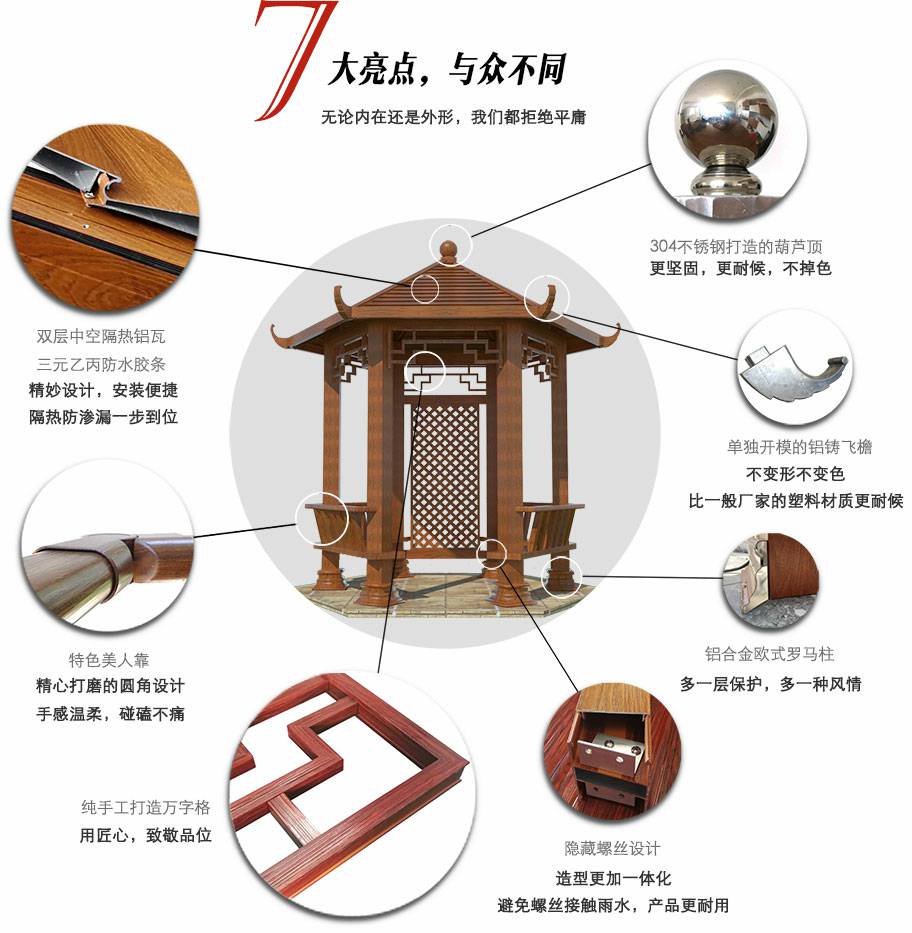 厦门维安绿色农业发展有限公司凉亭系列产品是采用高强度铝合金为原材料,经酸洗铬化,电泳或静电喷涂,木纹转印处理后,精密定制设计,保障安装。它具有防水防潮,不膨胀不变形,防腐蚀,具有逼真的木质感。成为别墅住宅及市政园林等建筑美丽的风景。